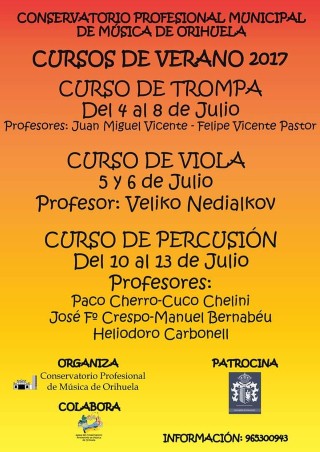 En cuanto al curso de viola será del 5 al 6 de julio, a cargo del profesor Veliko Nedialkov, mientras que el de percusión se ofrecerá del 10 al 13 de julio y contará con los profesores Paco Cherro, Cuco Chelini, José F. Crespo, Manuel Bernabéu y Heliodoro Carbonell.