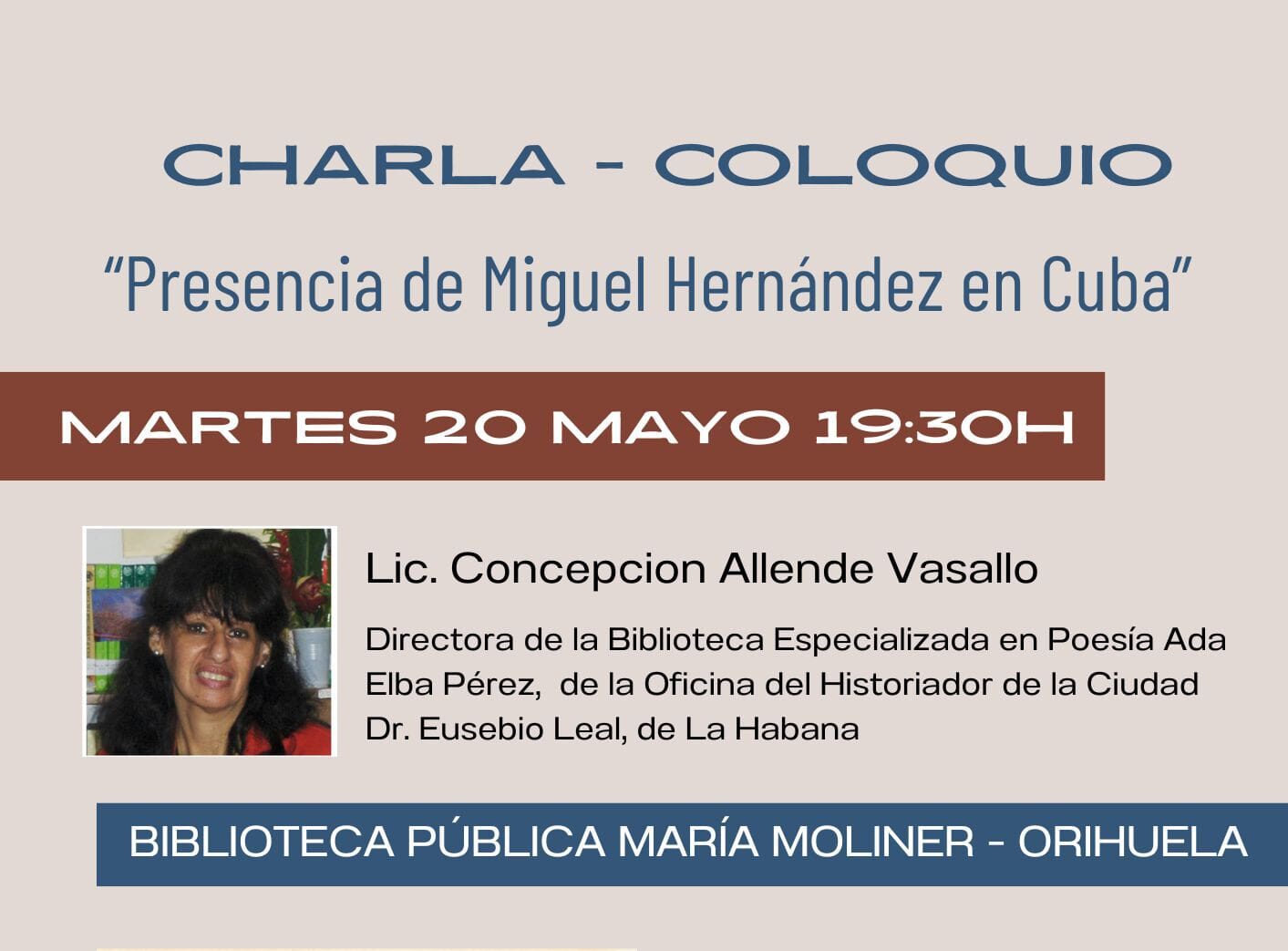 La bibliotecaria cubana Concepción Allende Vasallo hablará en Orihuela sobre la huella de Miguel Hernández en Cuba