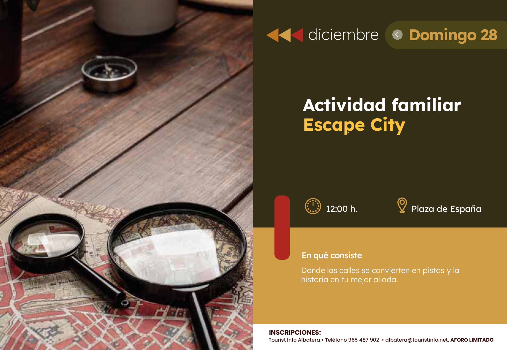 – Domingo 28 de diciembre, 12 horas: Actividad familiar denominada ‘Escape city’ en la plaza de España.