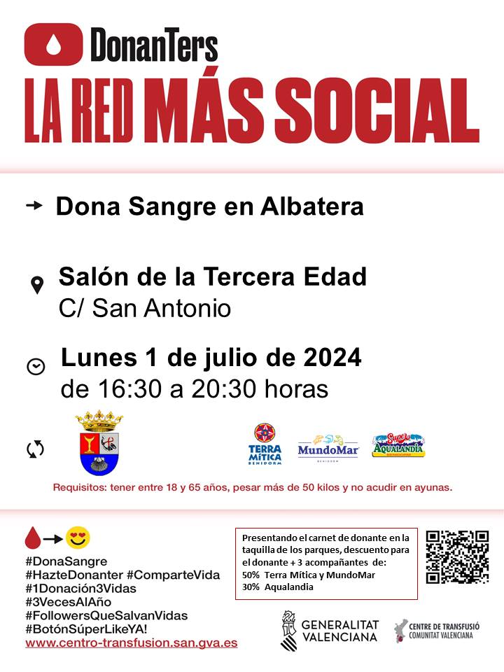 El Centro de Transfusiones de la Comunidad Valenciana, dependiente de la Generalitat Valenciana, y el Ayuntamiento de Albatera, con la colaboración de ‘Terra Mítica’, ‘Mundomar’ y ‘Aqualandia’, hacen un llamamiento para realizar una donación de sangre el lunes 1 de julio, desde las 16,30 hasta las 20,30 horas, en el salón de la Tercera Edad de Albatera (calle San Antonio).