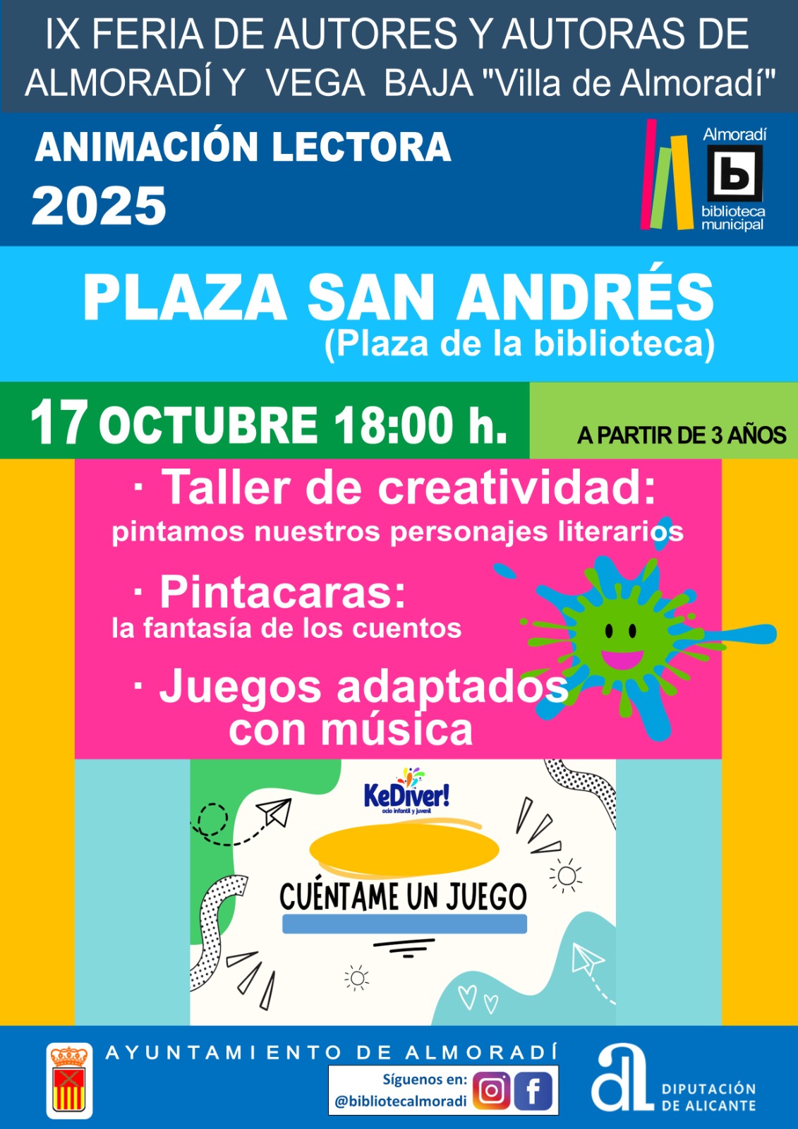 La Concejalía de Cultura del Ayuntamiento de Almoradí organiza el viernes 17 de octubre, a las 18 horas, diversas actividades para los más pequeños a partir de los tres años, como ‘Taller de creatividad’ para pintar personajes literarios, sesión de pintacaras con la fantasía de los cuentos y juegos adaptados con música titulado ‘Cuéntame un juego’, por ‘KeDiver!’, en la plaza San Andrés (plaza de la biblioteca infantil del Centro Cultural ‘Luis Martínez Rufete’), dentro de la IX Feria de Autores y Autoras de Almoradí y Vega Baja ‘Villa de Almoradí’.
