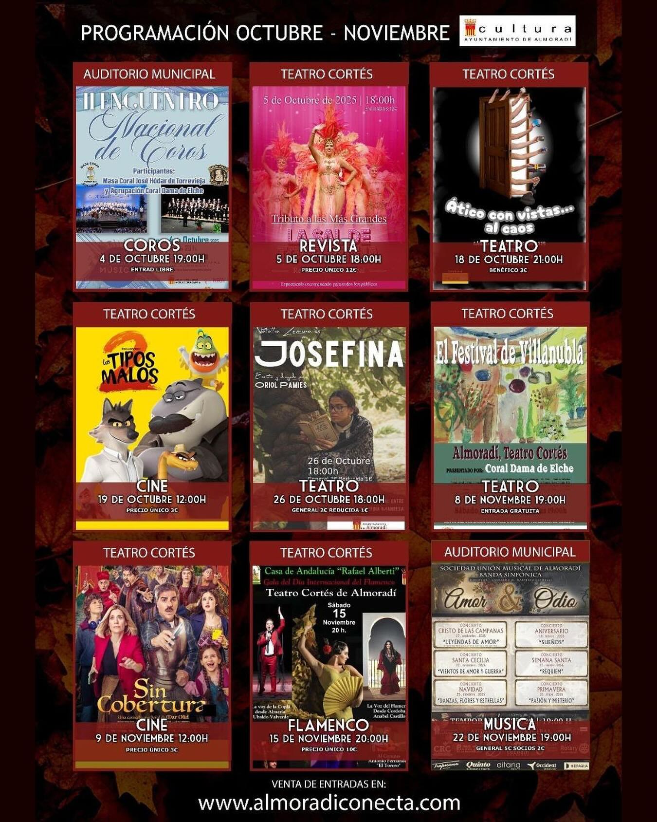 La Concejalía de Cultura del Ayuntamiento de Almoradí organiza entre el sábado 4 de octubre y el sábado 22 de noviembre diferentes actos culturales, como encuentro de coros, revista, representaciones de teatro y musicales, cine, espectáculos de flamenco y conciertos de música, entre otros, dentro de la programación cultural del último trimestre del año 2025 de la localidad almoradidense.