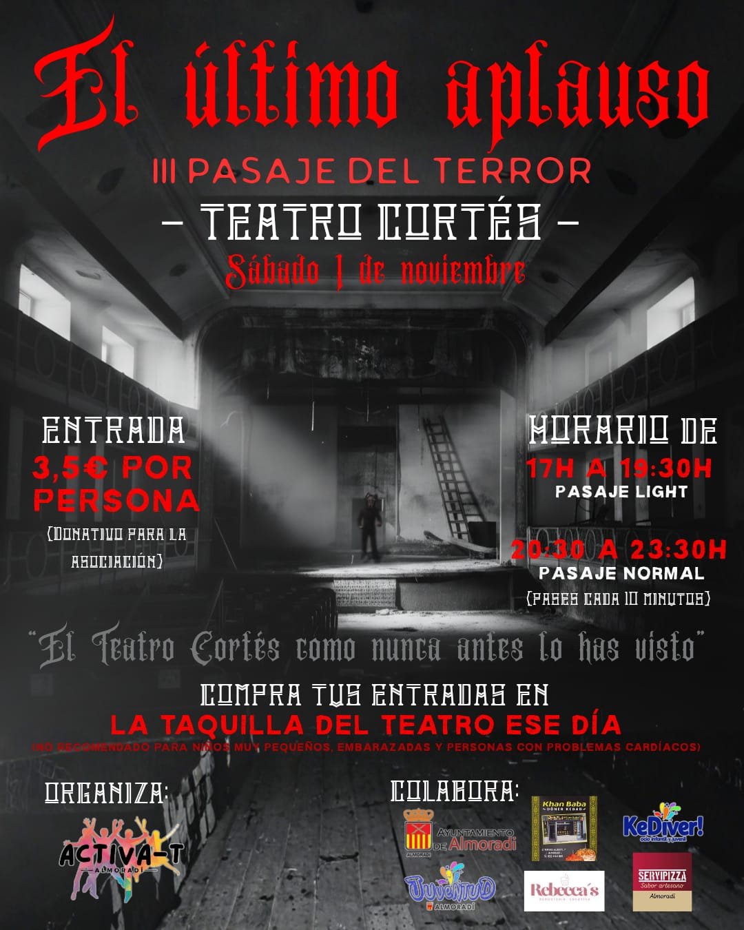 La asociación de jóvenes de Almoradí ‘Activa-t’, con la colaboración dela Concejalía de Juventud del Ayuntamiento de Almoradí, organiza el sábado 1 de noviembre, entre las 17 y las 23,30 horas, la tercera edición del ‘Pasaje del terror titulada ‘El último aplauso’ en el Teatro Cortés de la localidad almoradidense.