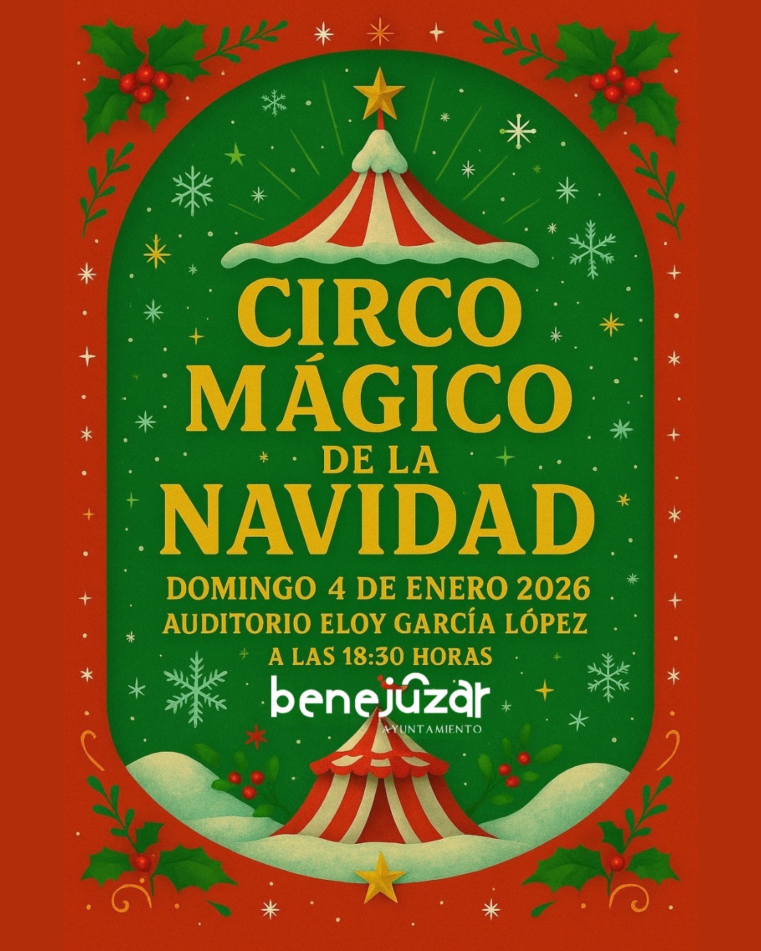 – 18,30 h.: Espectáculo titulado ‘El circo mágico de la Navidad’ para los más pequeños en el Auditorio Municipal ‘Eloy García López’.