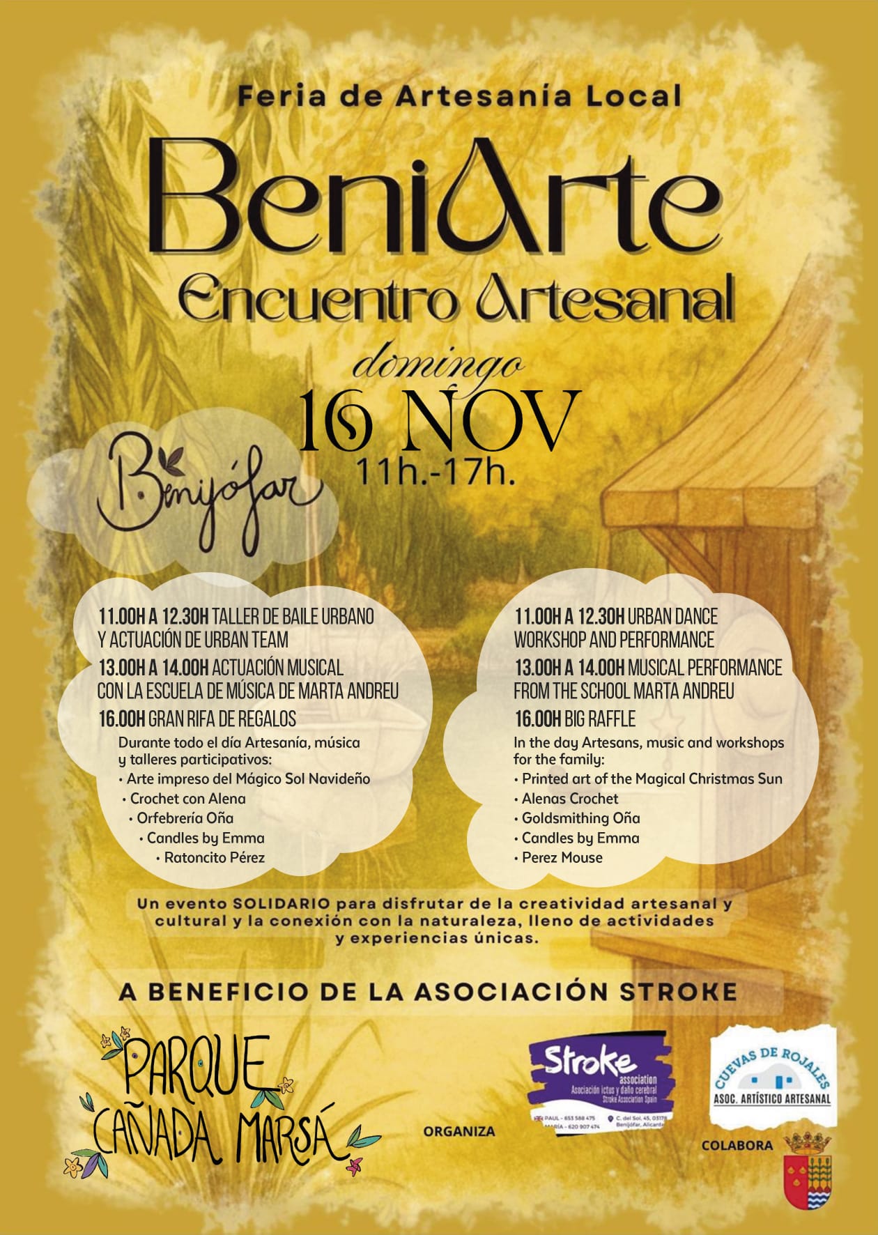 Benijófar, evento: Encuentro artesanal ‘BeniArte’ con feria de artesanía local, música y talleres, organizado por la asociación de ictus y daño cerebral ‘Stroke association’ y la asociación artístico artesanal ‘Cuevas de Rojales’