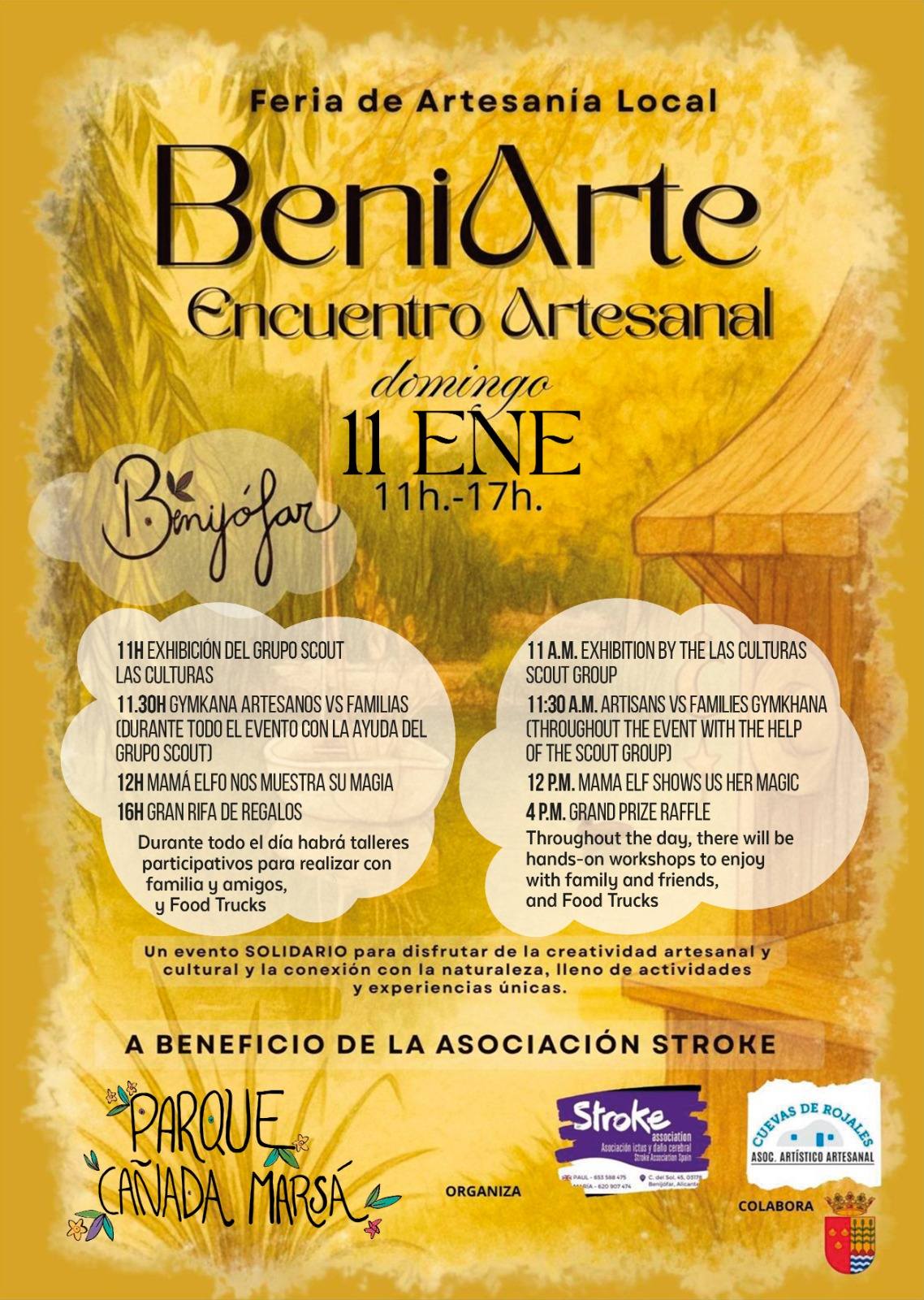 La asociación de ictus y daño cerebral ‘Stroke association’ de Benijófar y la asociación artístico artesanal ‘Cuevas de Rojales’, con la colaboración del Ayuntamiento de Benijófar, organizan el domingo 11 de enero de 2026, desde las 11 hasta las 17 horas, el encuentro artesanal denominado ‘BeniArte’ a beneficio de la propia asociación en el parque Cañada Marsá de la localidad benijofera.