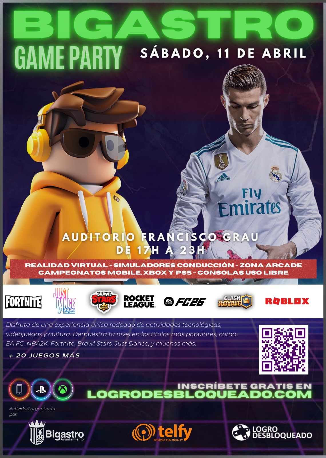 La empresa especializada ‘Logro Desbloqueado’ y el Ayuntamiento de Bigastro organizan para el sábado 11 de abril, desde las 17 hasta las 23 horas, el ‘Bigastro Game Party’, una experiencia única rodeada de actividades tecnológicas, videojuegos y cultura destinadas a jóvenes y también a sus familias, en el Auditorio Municipal ‘Francisco Grau’ de la localidad bigastrense.