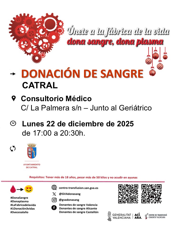 El Centro de Transfusiones de la Comunidad Valenciana, dependiente de la Generalitat Valenciana, y el Ayuntamiento de Catral hacen un llamamiento para realizar una donación de sangre el lunes 22 de diciembre, desde las 17 hasta las 20,30 horas, en el consultorio médico de la localidad catralense (calle La Palmera-junto al geriátrico).