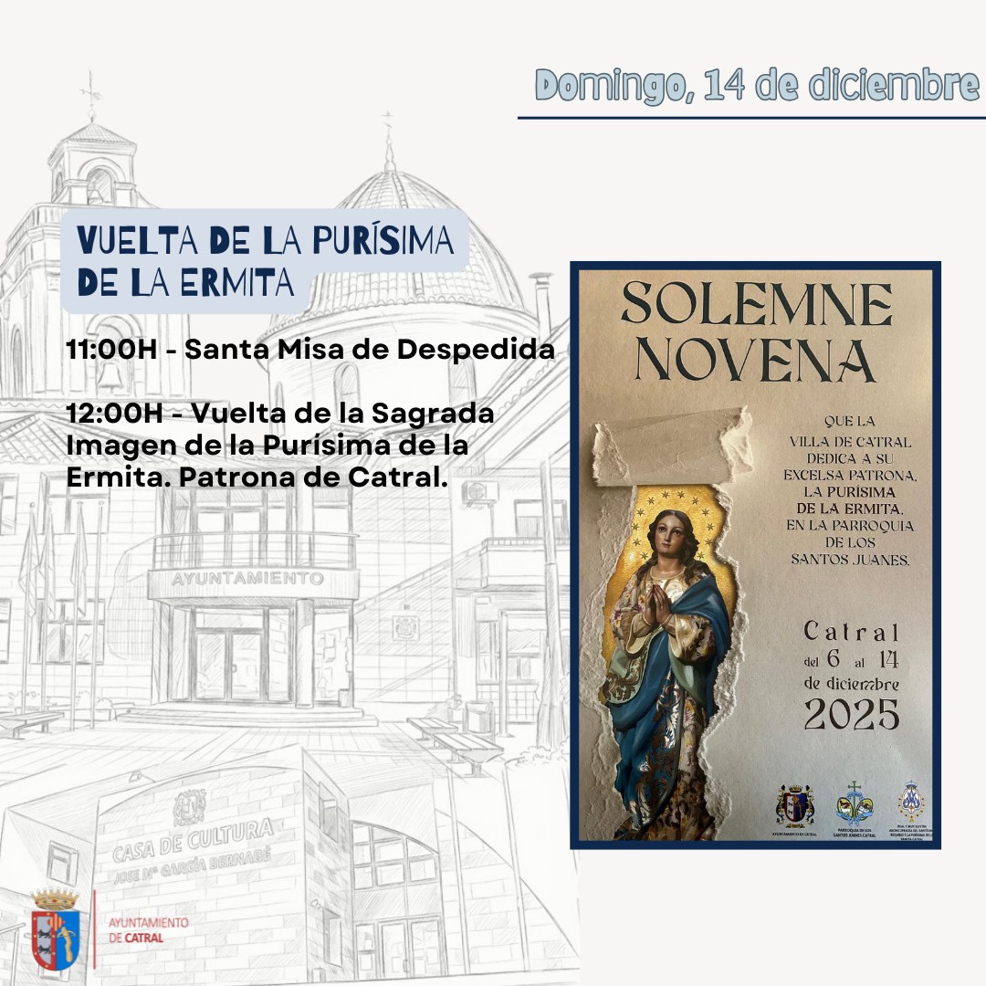 – Del sábado 6 al domingo 14 de diciembre, 18,15 horas: Rosario, novena a la Purísima y celebración de la misa.