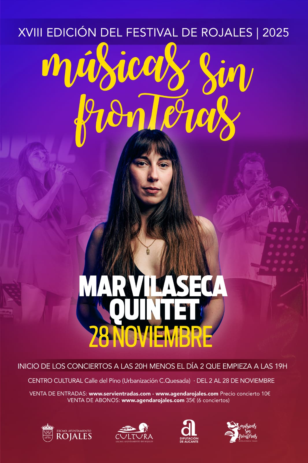 – Viernes 28 de noviembre, 20 horas: Concierto de ‘Mar Vilaseca Quintet’ en el Centro Cultural de Ciudad Quesada de la localidad rojalera, dentro del festival de música bajo la denominación XVIII ‘Músicas sin fronteras’.