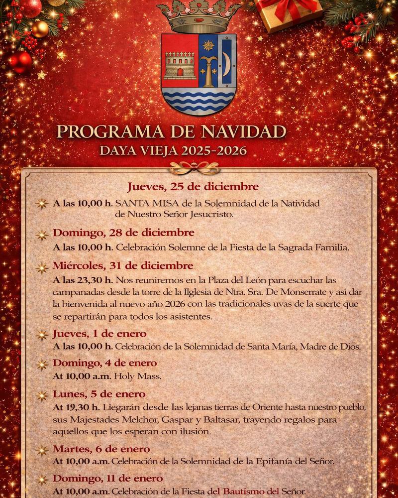 El Ayuntamiento de Daya Vieja organiza el lunes 5 de enero de 2026, a las 19,30 horas, la llegada de Sus Majestades los Reyes Magos de Oriente, Melchor, Gaspar y Baltasar, a la localidad para realizar la entrega de regalos.