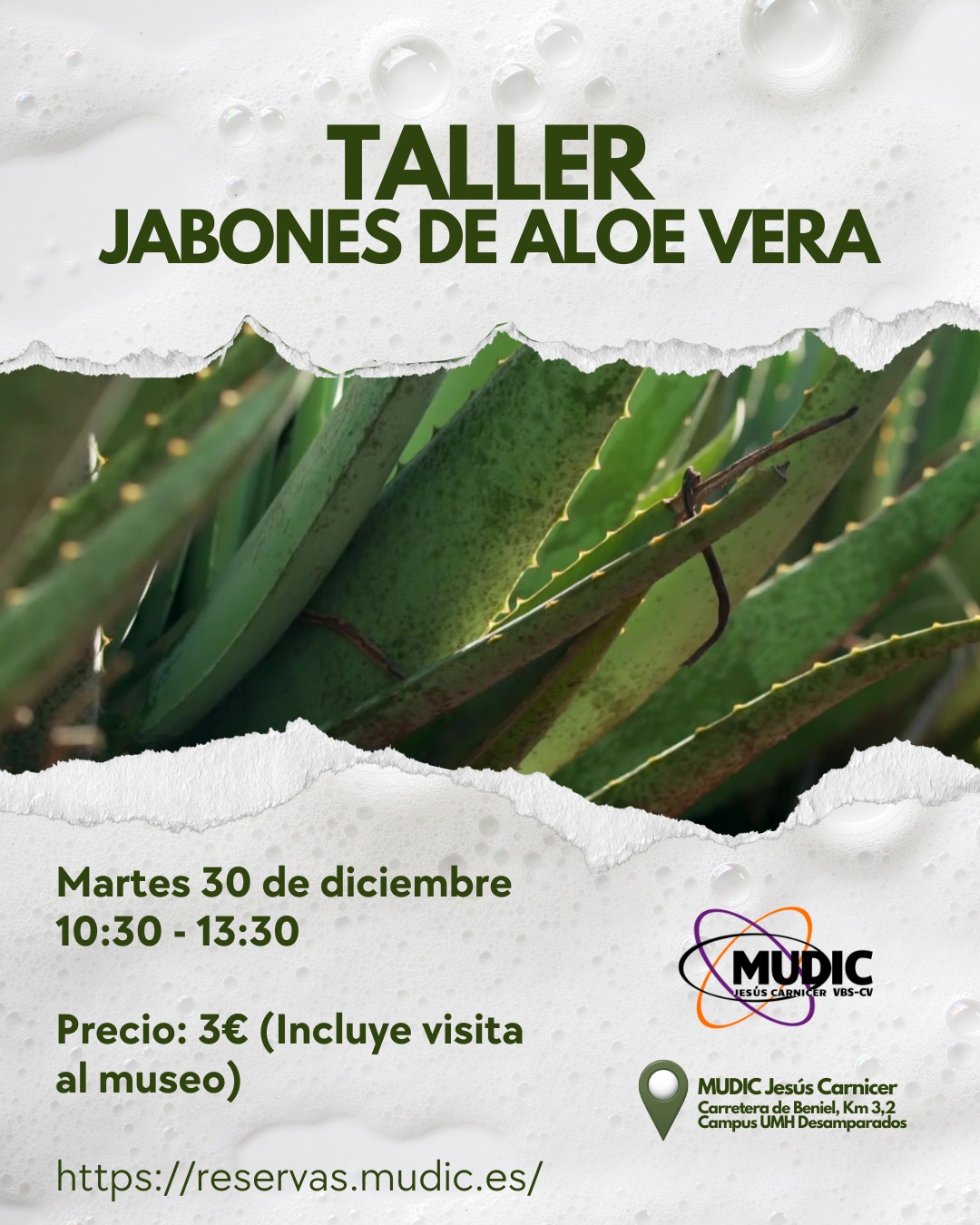 El Museo Didáctico e Interactivo de Ciencias de la Vega Baja del Segura (MUDIC ‘Jesús Carnicer’) ha programado para el martes 30 de diciembre, de las 10,30 a las 13,30 horas, el taller que lleva por título ‘Jabones de aloe vera‘ en las instalaciones del mismo museo en el campus de Desamparados de la UMH (Universidad Miguel Hernández), situado en la pedanía oriolana de Desamparados.