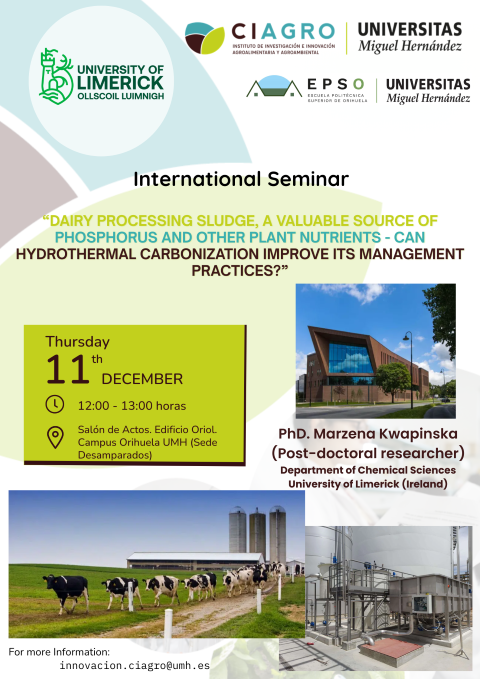 Desamparados de Orihuela, evento: Seminario internacional ‘Lodos del procesamiento de productos lácteos, una valiosa fuente de fósforo y otros nutrientes vegetales: ¿puede la carbonización hidrotermal mejorar sus prácticas de gestión?’, organizado por el CIAGRO de la Universidad Miguel Hernández (UMH)