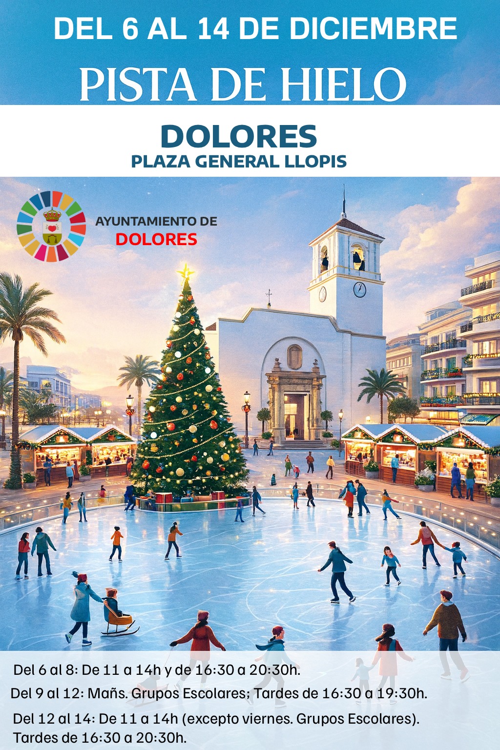 El Ayuntamiento de Dolores instala entre el sábado 6 y el domingo 14 de diciembre una pista de patinaje sobre hielo en la plaza General Llopis de la localidad dolorense.