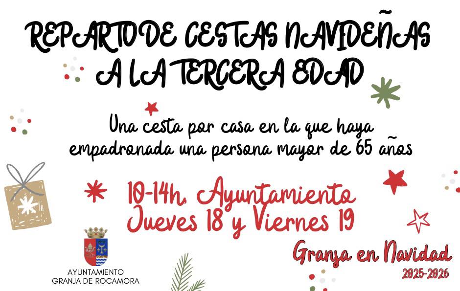 – Jueves 18 de diciembre, 10 a 14 horas: Reparto de cestas navideñas a la Tercera Edad en el Ayuntamiento.