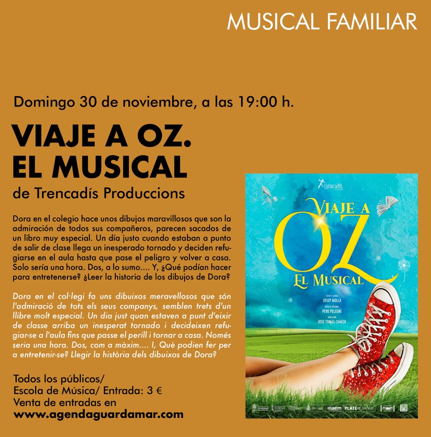 – Domingo 30 de noviembre, 19 horas: Representación del musical familiar titulado ‘Viaje a OZ. El musical’, dirigida por José Tomás Cháfer, por ‘Trencadís Produccions, en la Escola de Música.