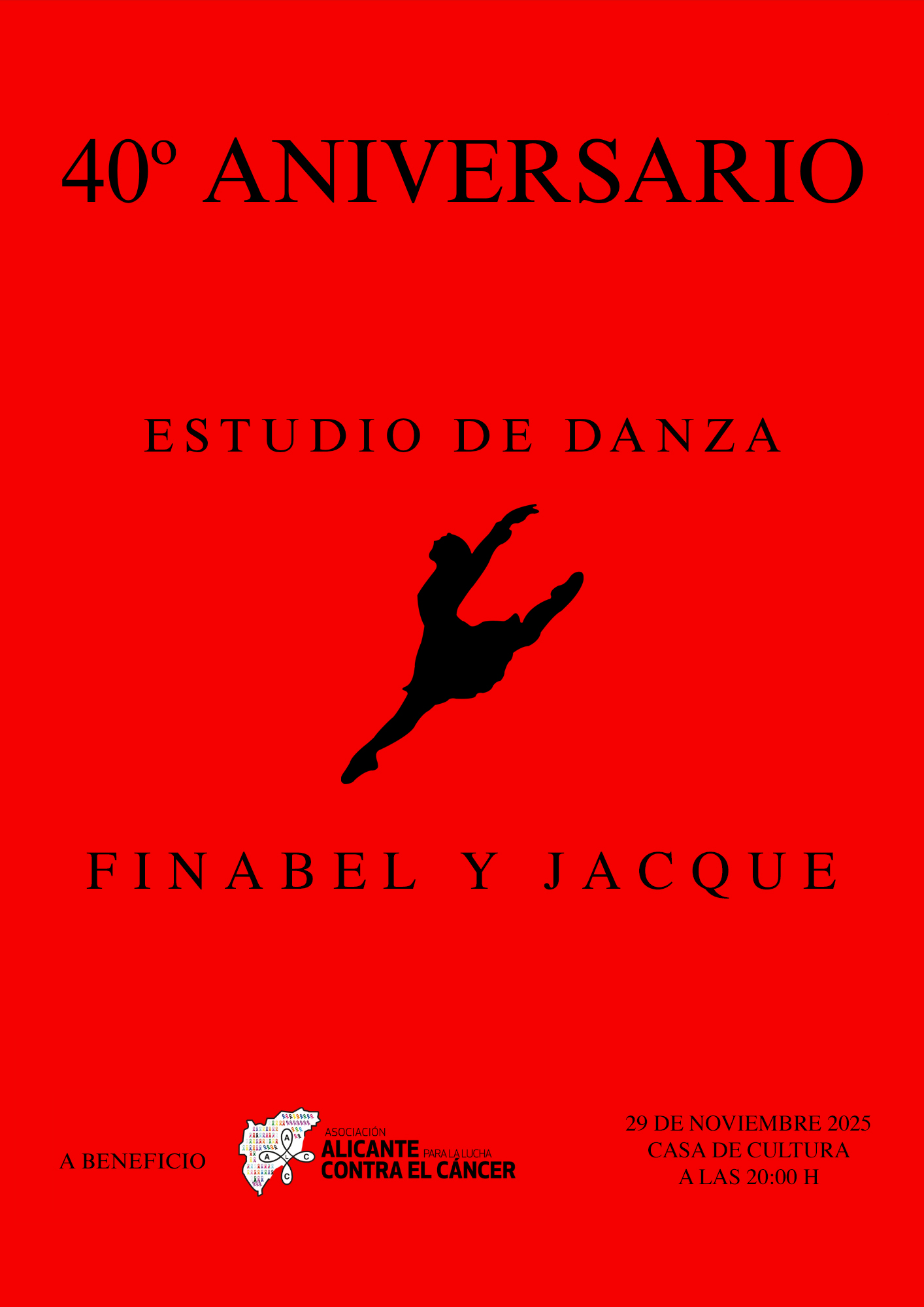 – 20 h.: Espectáculo de danza benéfico a beneficio de la asociación ‘Alicante para la Lucha Contra el Cáncer’, por el estudio de danza ‘Finabel y Jacque’, en su 40º aniversario en la Casa de Cultura.