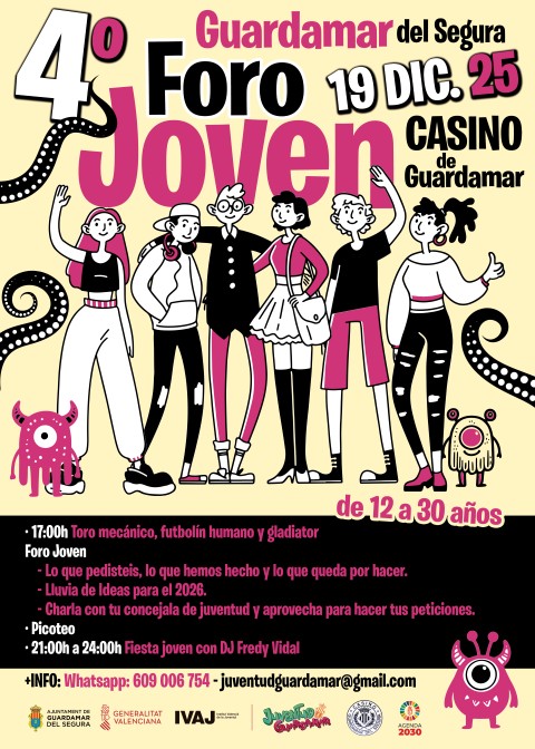 – 17 h.: Cuarto Foro Joven, en el que se debatirán las diferentes propuestas de la juventud que crean que son necesarias en el municipio, para edades de 12 a 30 años en el Casino de Guardamar.