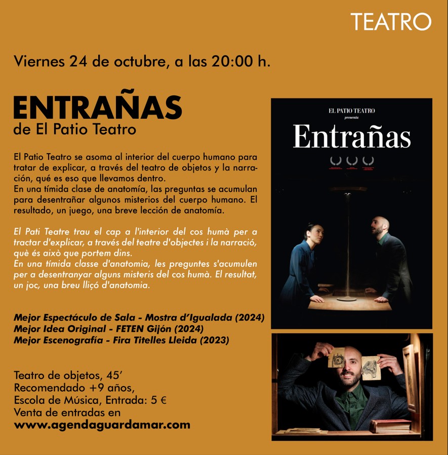 – 20 h.: Representación de la obra de teatro de objetos titulada ‘Entrañas’, por la compañía ‘El patrio teatro’ en la Escola de Música.