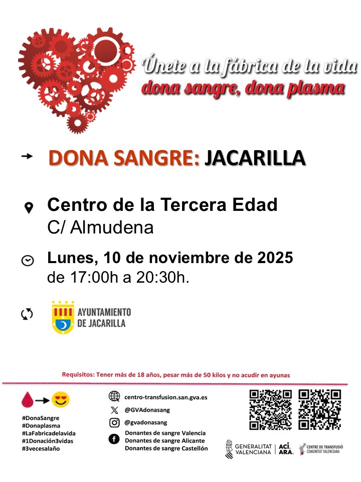 El Centro de Transfusiones de la Comunidad Valenciana, dependiente de la Generalitat Valenciana, y el Ayuntamiento de Jacarilla hacen un llamamiento para realizar una donación de sangre el lunes 10 de noviembre, desde las 17 hasta las 20,30 horas, en el centro de la Tercera Edad de la localidad jacarillense.