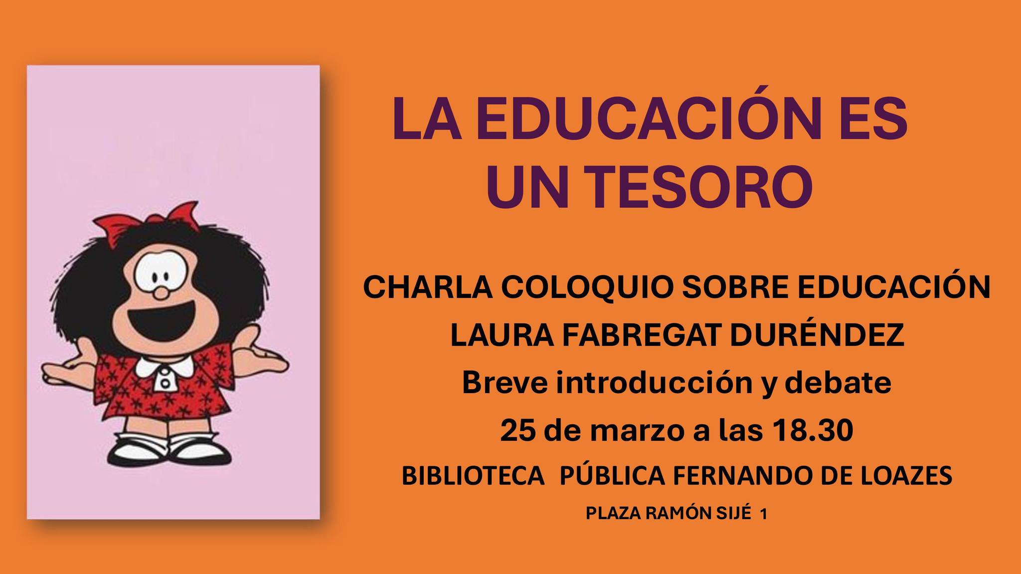 – 18,30 h.: Charla coloquio sobre educación con el título ‘La educación es un tesoro’, a cargo de la escritora Laura Fabregat, con breve introducción y debate.