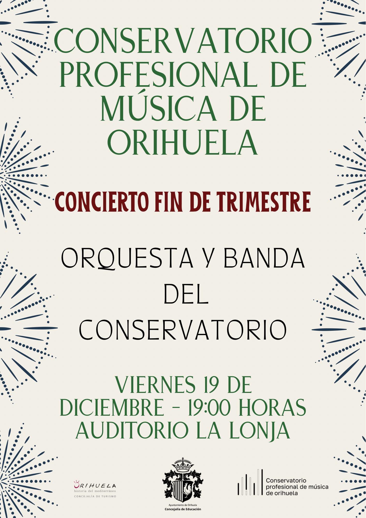 El Conservatorio Profesional de Música ‘Pedro Terol’ de Orihuela organiza el viernes 19 de diciembre, a las 19 horas, el concierto de fin de trimestre, a cargo de la orquesta y banda del propio conservatorio, en el Auditorio del Centro Cultural ‘La Lonja’ de la ciudad oriolana.