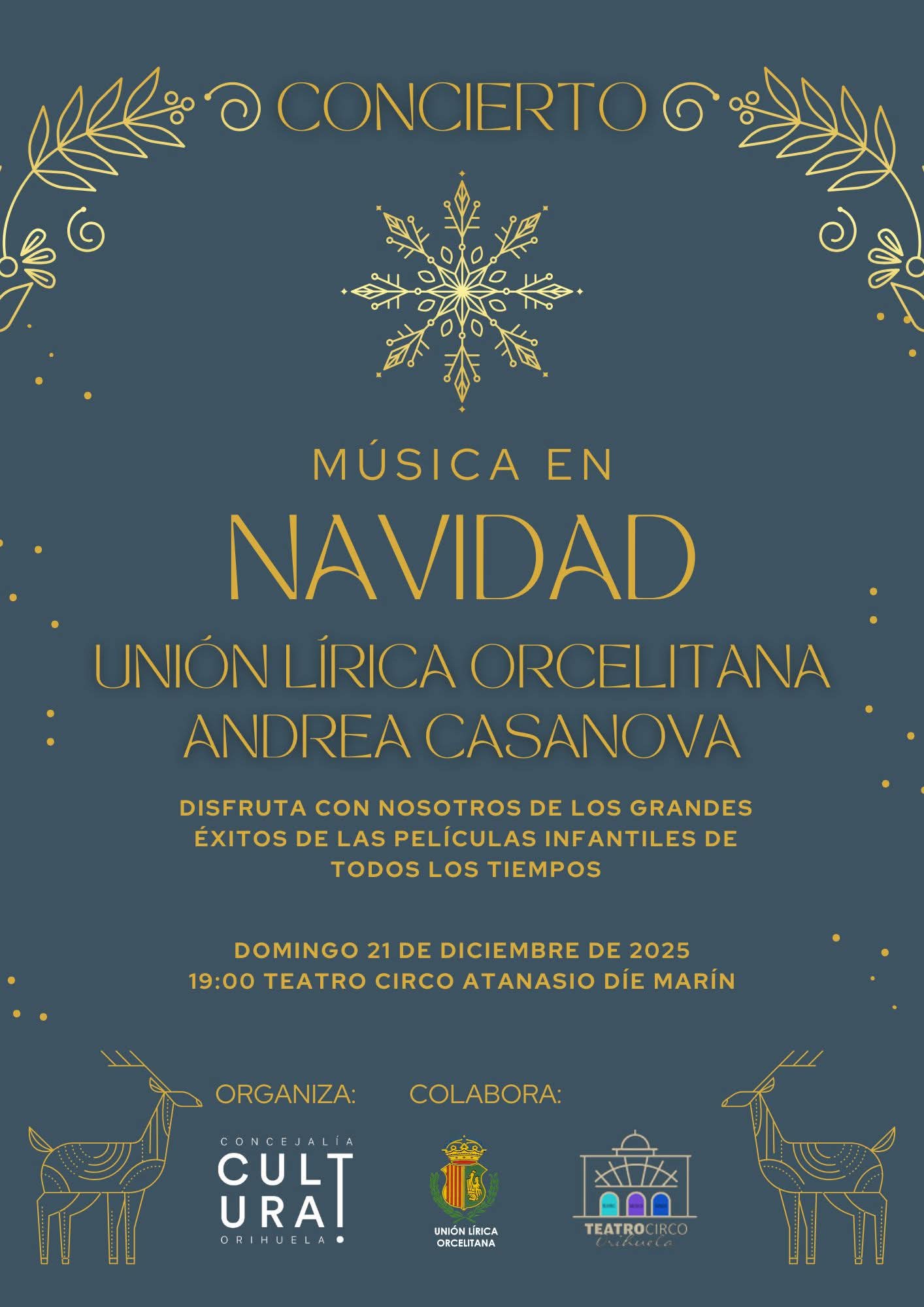 – Domingo 21 de diciembre, 19 horas: Concierto con el título ‘Música en Navidad’, a cargo de la Unión Lírica Orcelitana (ULO), con la participación de la cantante Andrea Casanova, en el Teatro Circo ‘Atanasio Die’.