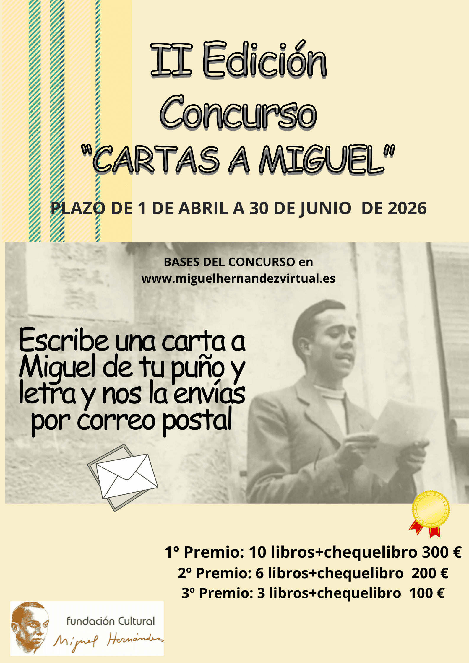 La Fundación Cultural Miguel Hernández convoca la segunda edición del concurso de carácter nacional ‘Cartas a Miguel’ entre el miércoles 1 de abril y el martes 30 de junio, como plazo de participación y de entrega de las cartas enviadas, para mayores de 18 años.
