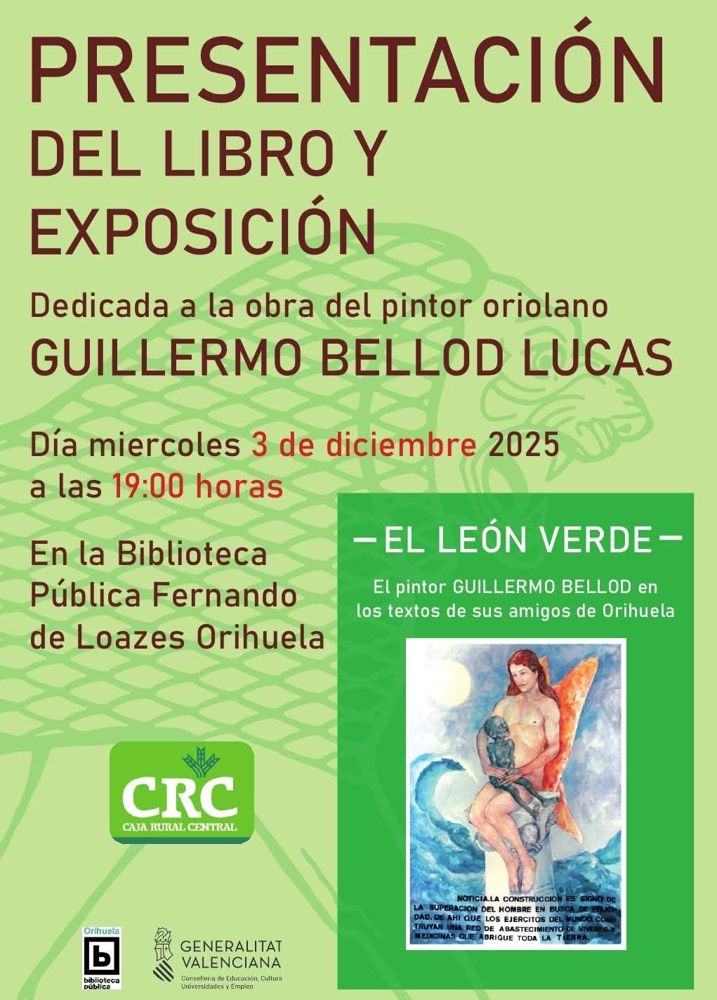 Orihuela, evento cultural: Presentación del libro 'El león verde' y de la exposición dedicada a la obra del pintor oriolano Guillermo Bellod, dentro de los actos de la Biblioteca Pública y Archivo Histórico ‘Fernando de Loazes’Miércoles 3 de diciembre