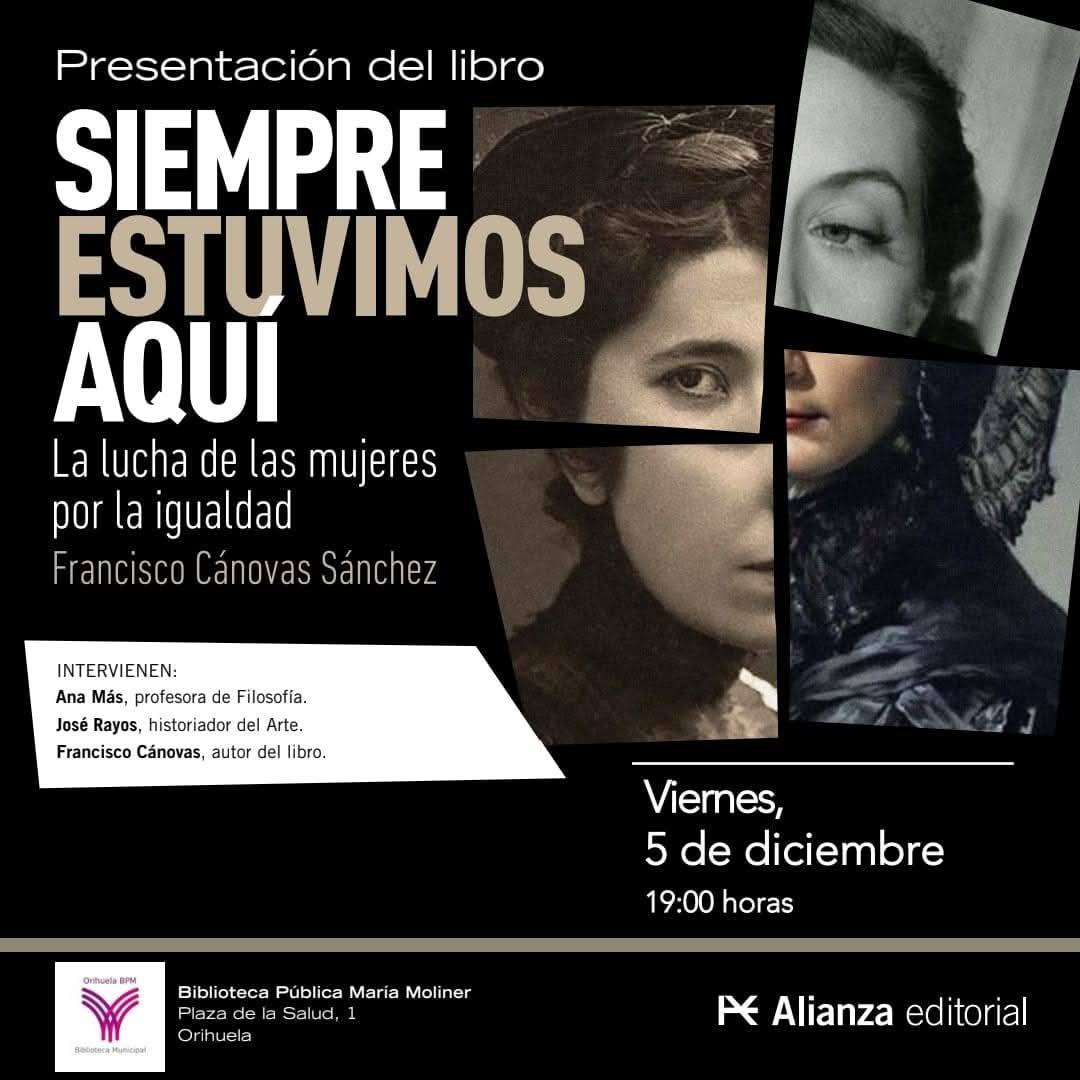La Biblioteca Municipal ‘María Moliner’ de Orihuela organiza el viernes 5 de diciembre, a las 19 horas, en sus instalaciones la presentación del libro titulado ‘Siempre estuvimos aquí. La lucha de las mujeres por la igualdad’, del escritor Francisco Cánovas Sánchez.