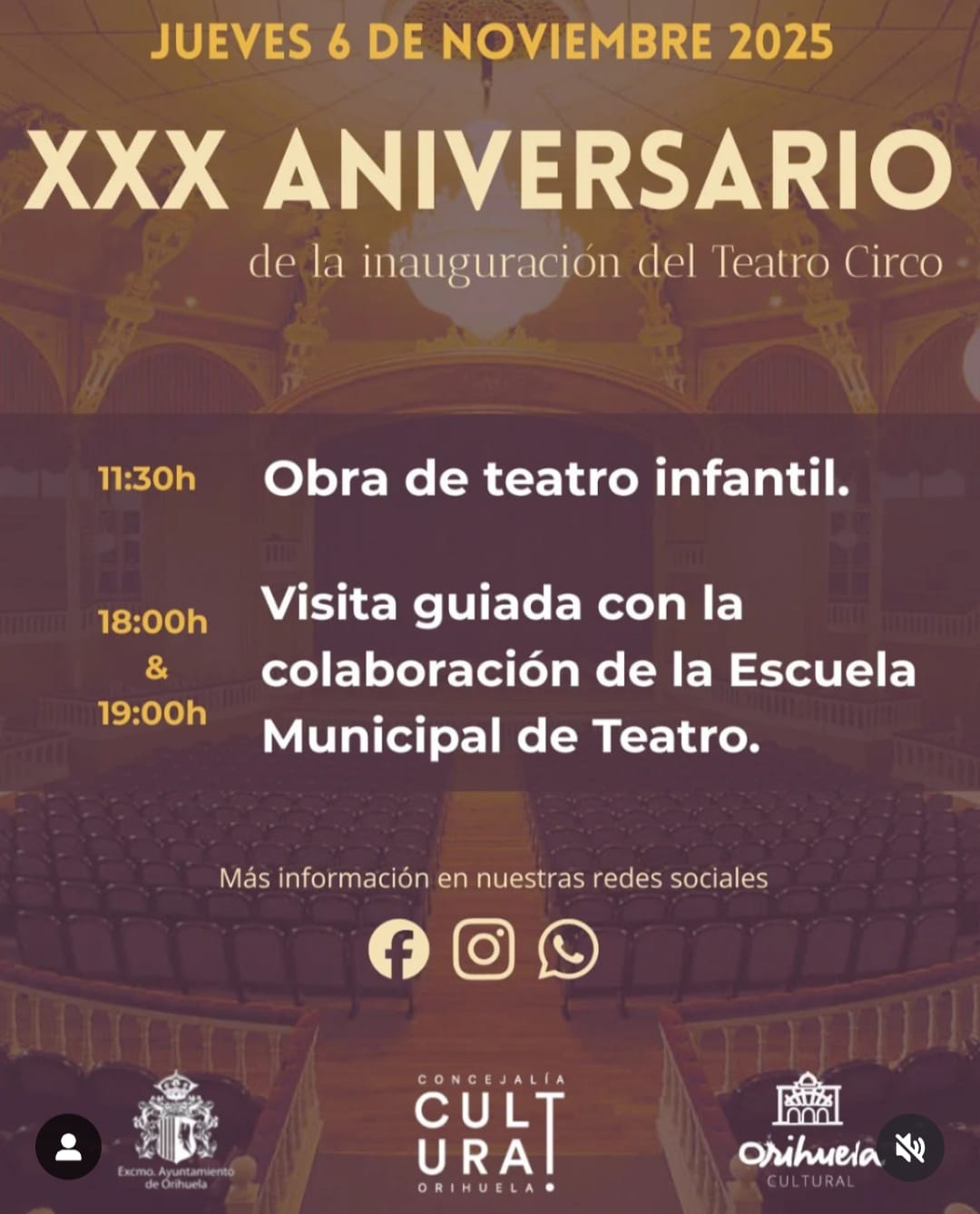 – 19 h.: Visita guiada para conocer su historia con la colaboración de la Escuela Municipal de Teatro en el Teatro Circo ‘Atanasio Die’, dentro de los actos del XXX aniversario de la inauguración del Teatro Circo ‘Atanasio Die’.