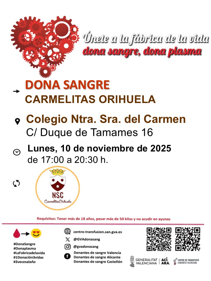 El Centro de Transfusiones de la Comunidad Valenciana, dependiente de la Conselleria de Sanidad de la Generalitat Valenciana, y Carmelitas de Orihuela hacen un llamamiento a los ciudadanos para realizar una donación de sangre el lunes 10 de noviembre, desde las 17 hasta las 20,30 horas, en el colegio Nuestra Señora del Carmen de la localidad oriolana (calle Duque de Tamames, 16).