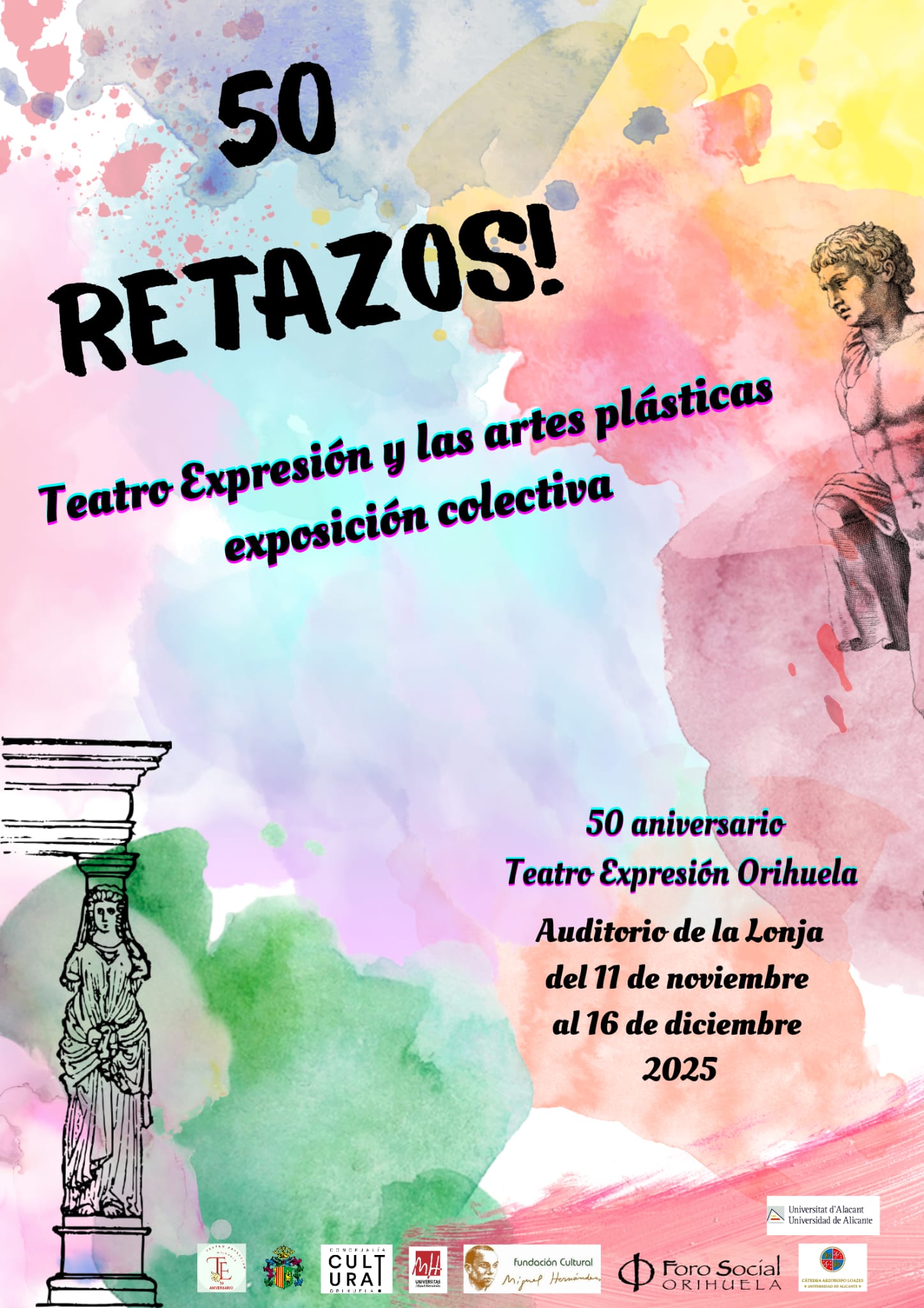 Orihuela, evento: Exposición colectiva '50 retazos. Teatro Expresión y las artes plásticas', dentro de los actos del 50º aniversario de la compañía 'Teatro Expresión'La exposición colectiva con el título ’50 retazos. Teatro Expresión y las artes plásticas’ se podrá ver hasta el martes 16 de diciembre de martes a domingo y festivos, de 10 a 14 horas, y de martes a sábados, de 16 a 19 horas, en el Centro Cultural ‘La Lonja’, dentro de los actos del 50º aniversario de la compañía ‘Teatro Expresión’.