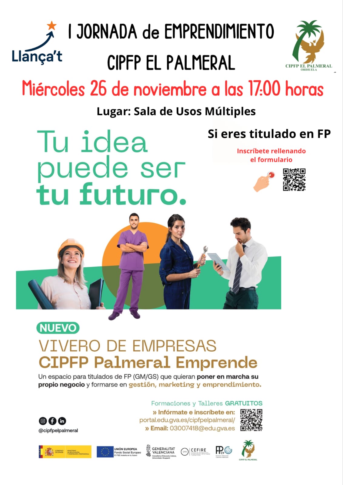 La sala multiusos del Centro Integrado de Formación Profesional (CIPFP) de El Palmeral de Orihuela acogerá el miércoles 26 de noviembre, a las 17 horas, la primera edición de la Jornada de Emprendimiento dentro del proyecto Llança’t.