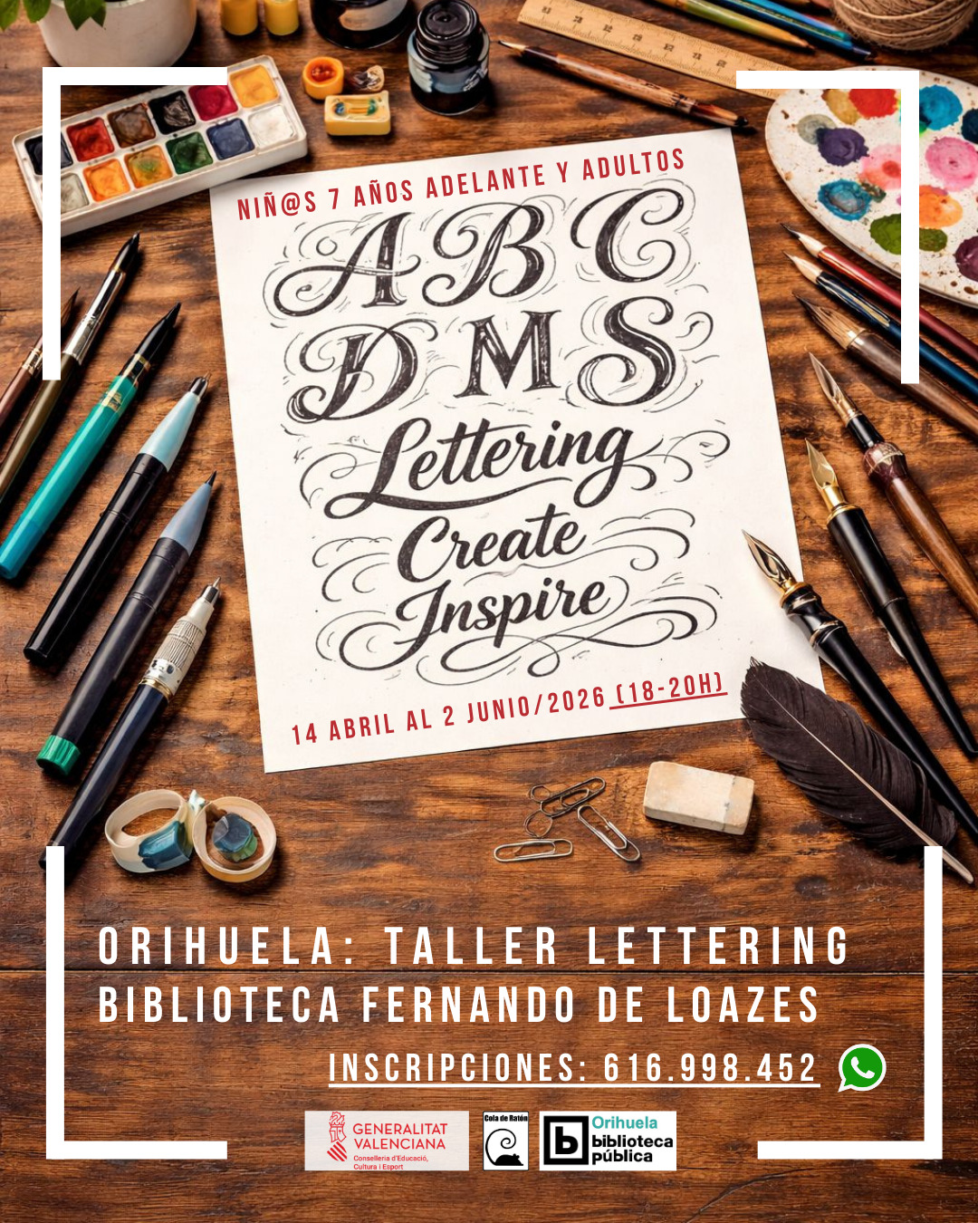 La Biblioteca Pública del Estado y Archivo Histórico ‘Fernando de Loazes’ de Orihuela organiza desde el martes 14 de abril hasta el martes 2 de junio, de 17 a 20 horas, excepto festivos, el taller de ‘lettering’ para edades a partir de 7 años y adultos.