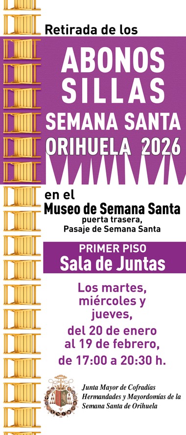 La Junta Mayor de Cofradías, Hermandades y Mayordomías de la Semana Santa de Orihuela organiza este año 2026 la gestión de las sillas para los desfiles procesionales de la próxima Semana Santa, cuya retirada se realizará entre el martes 20 de enero y el jueves 19 de febrero, los martes, los miércoles y los jueves, de 17 a 20,30 horas, en el Museo de Semana Santa con entrada por la puerta trasera del pasaje de Semana Santa.