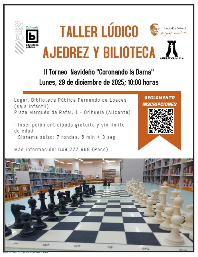 Orihuela, evento: Taller lúdico ‘Ajedrez y biblioteca’ en la segunda edición del torneo navideño ‘Coronando la Dama’, dentro de los actos de la Biblioteca Pública y Archivo Histórico ‘Fernando de Loazes’