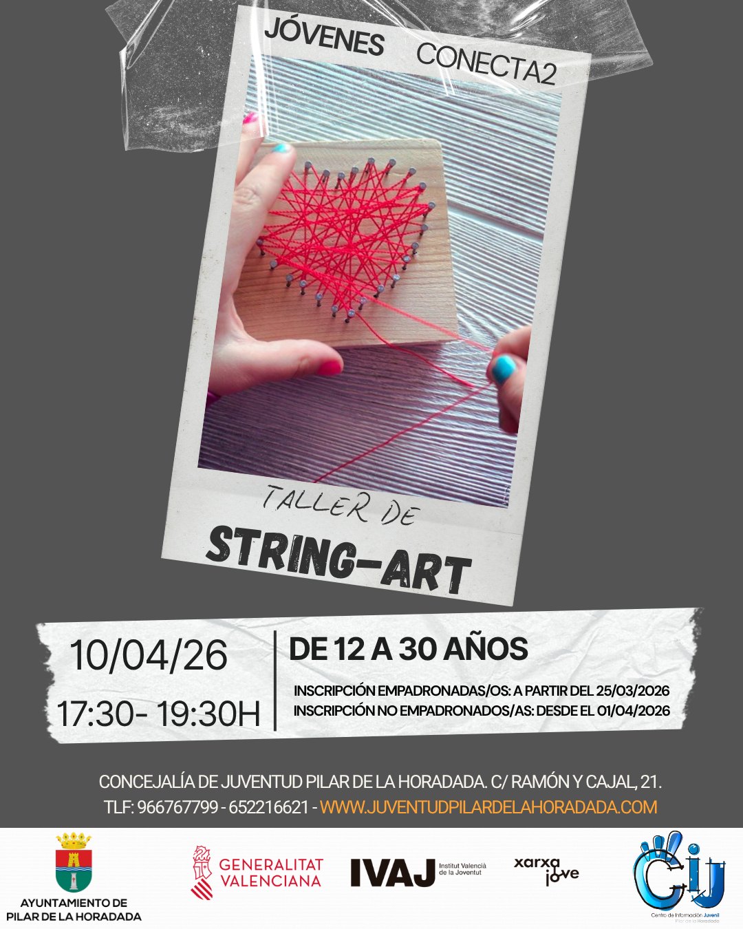 El Centro de Información Juvenil (CIJ) de la Concejalía de Juventud del Ayuntamiento de Pilar de la Horadada organiza para el viernes 10 de abril, de las 17,30 a las 19,30 horas, el taller gratuito de ‘string-art’, dirigido a jóvenes de 12 a 30 años, dentro de las actividades del programa de ocio educativo ‘Jóvenes Conecta2’.