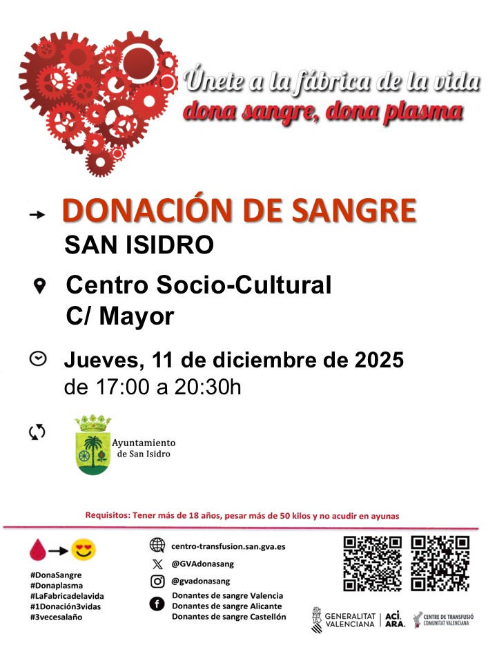 El Centro de Transfusiones de la Comunidad Valenciana, dependiente de la Generalitat Valenciana, y el Ayuntamiento de San Isidro hacen un llamamiento para realizar una donación de sangre el jueves 11 de diciembre, desde las 17 hasta las 20,30 horas, en el Centro Socio-cultural de San Isidro (calle Mayor).