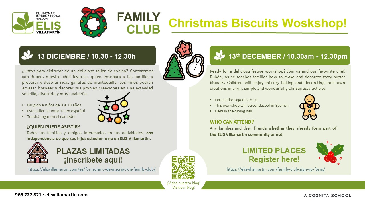 En el taller, al que pueden asistir niños con independencia de que pertenecen o no al colegio ELIS Villamartín y con edades de entre 3 y 10 años, los asistentes prepararán y decorarán ricas galletas de mantequilla navideñas. Los niños podrán amasar, hornear y dar color a sus propias galletas, guiados por el ‘chef’ Rubén.
