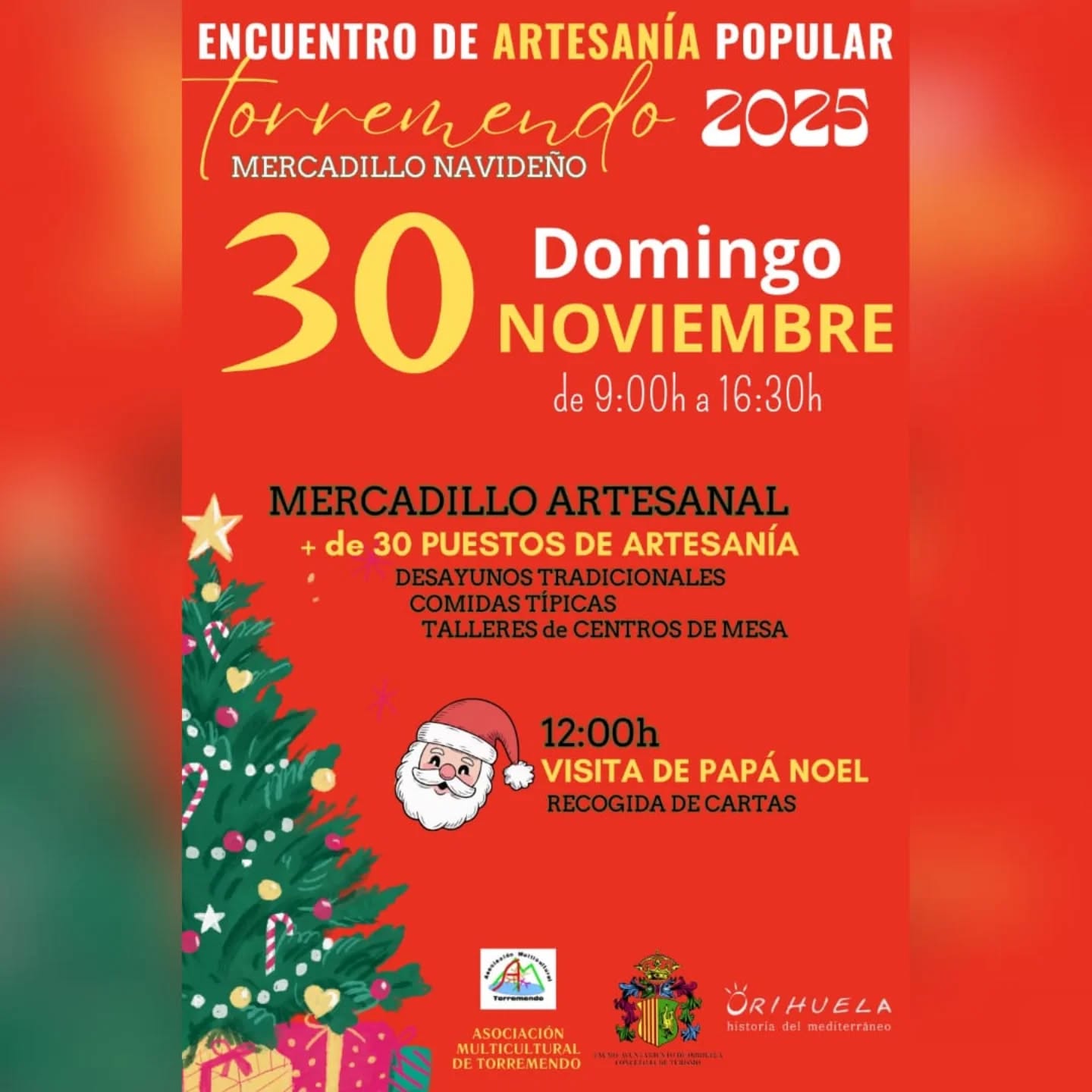 – 9 a 16,30 horas: Encuentro de artesanía popular con mercadillo navideño y sus 30 puestos artesanales, desayunos tradicionales, comidas típicas y talleres de centros de mesa en la plaza de la Iglesia de Torremendo.