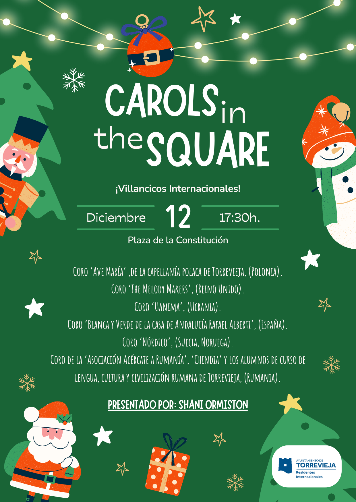 En esta XXIII edición, organizada por la Concejalía de Residentes Internacionales y presentada por la cantante torrevejense Shani Ormiston, actuarán el coro ‘Ave María’ de la Capellanía Polaca de Torrevieja, el coro ‘The Melody Makers’, de Reino Unido; el coro ‘Uanima’, de Ucrania; el coro ‘Blanca y verde’ de la Casa de Andalucía ‘Rafael Alberti’, de España; el coro ‘Nórdico’, de Suecia y Noruega; el coro de la asociación ‘Acércate a Rumanía’, ‘Chindia’ y los alumnos de curso de lengua, cultura y civilización rumana de Torrevieja.