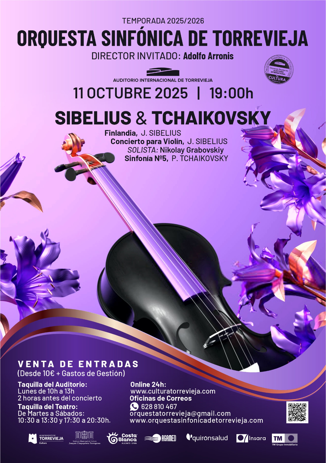 – 19 h.: Concierto con el título ‘Sibelius & Tchaikovsky’, por la Orquesta Sinfónica de Torrevieja (OST), bajo la dirección del director invitado, Adolfo Arronis, en el Auditorio Internacional, dentro del primer concierto de la temporada 2025-2026.