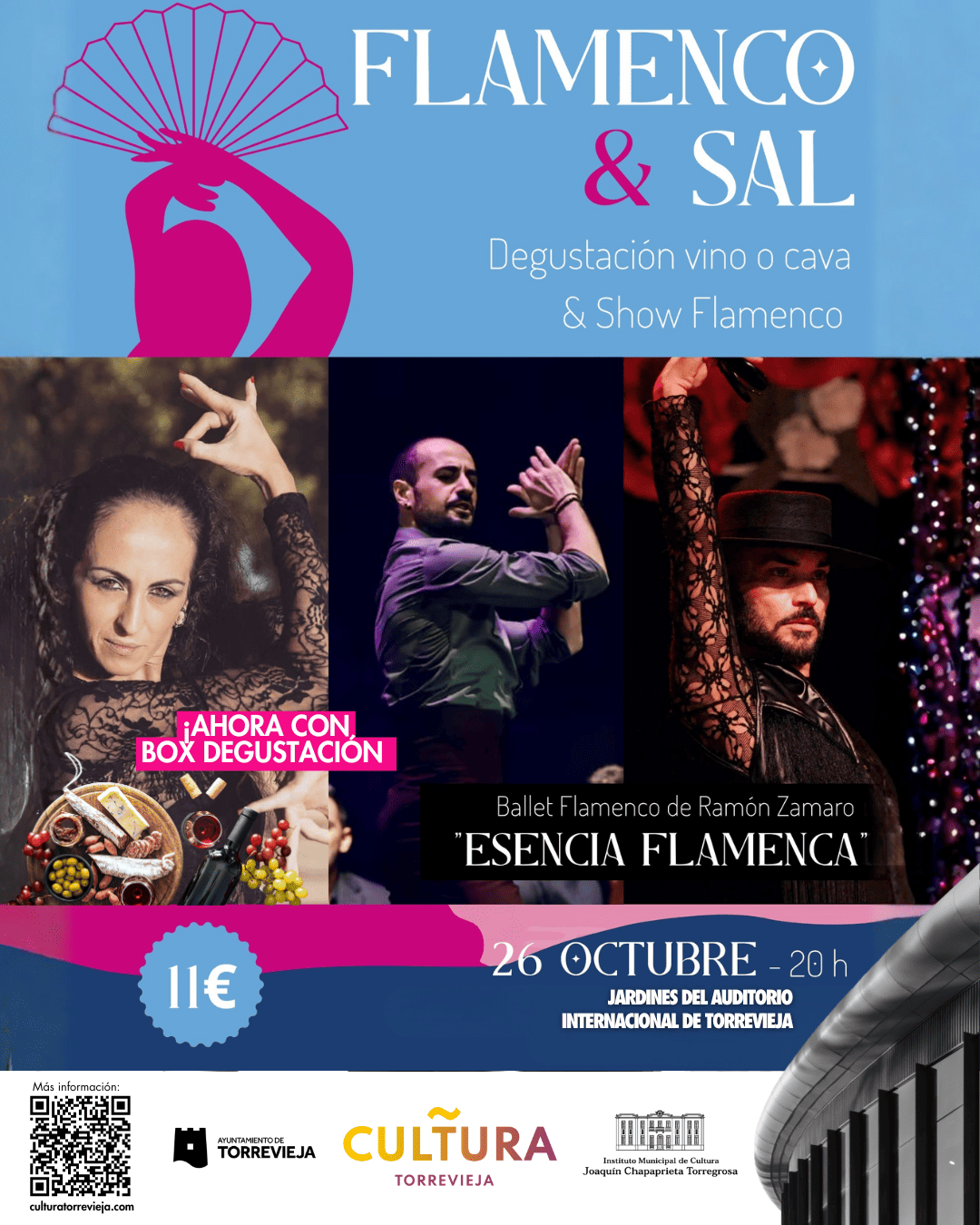 – 20,30 h.: Séptima edición del ciclo ‘Flamenco & Sal’ con degustación de vino o cava y espectáculo flamenco titulado ‘Esencia flamenca’, por el ballet de flamenco de Ramón Zamaro, en los jardines del Auditorio Internacional.