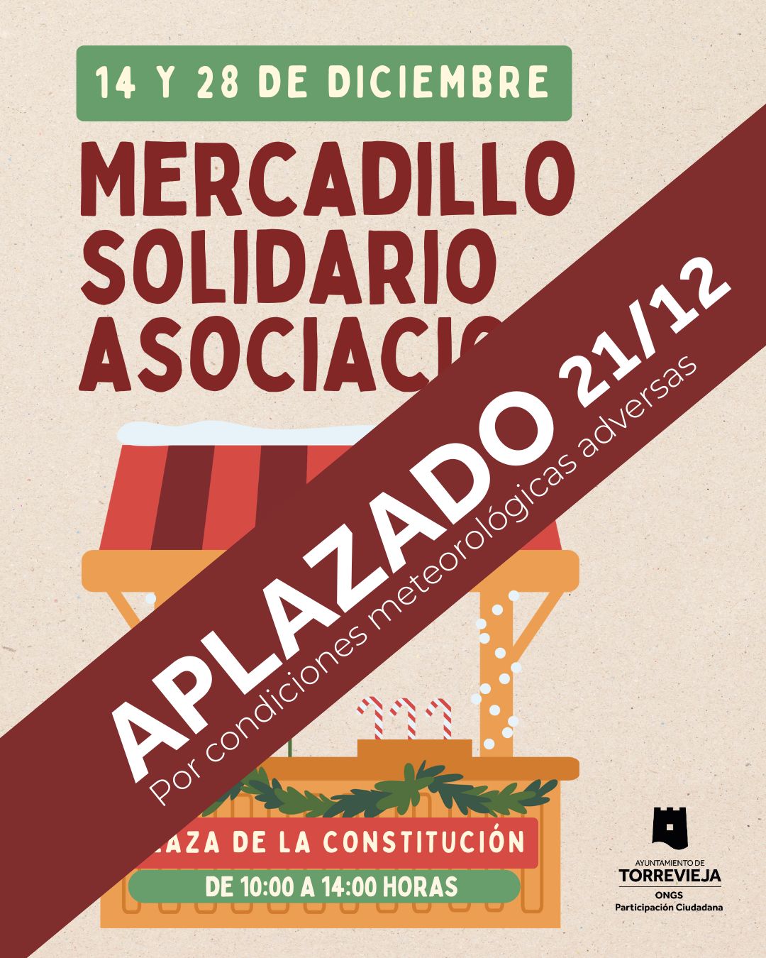 – 10,30 a 14 horas: APLAZADO al DOMINGO 21 Mercadillo solidario en la plaza de la Constitución.