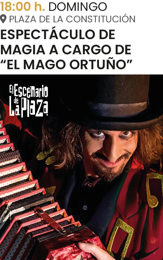 – 18 h.: Espectáculo de magia a cargo del mago Ortuño en el escenario de la plaza de la Constitución.
