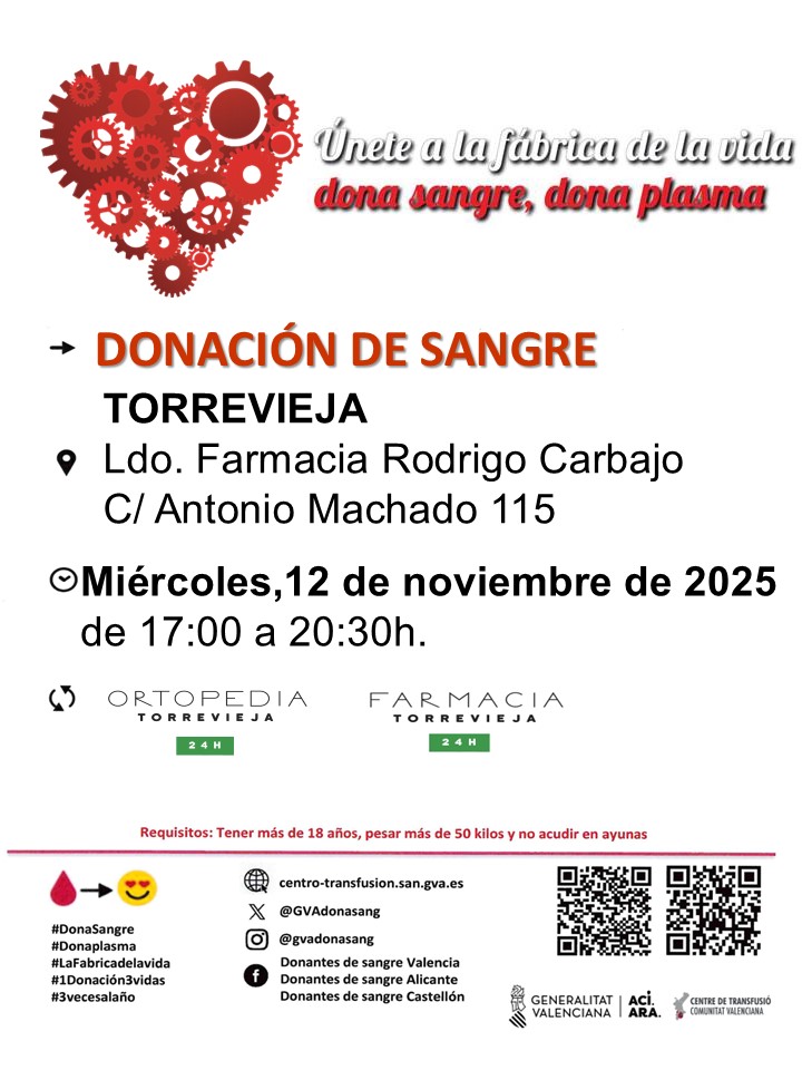 El Centro de Transfusiones de la Comunidad Valenciana, dependiente de la Generalitat Valenciana, y la Farmacia ‘Rodrigo Carbajo’ y Ortopedia de Torrevieja hacen un llamamiento para realizar una donación de sangre el miércoles 12 de noviembre, desde las 17 hasta las 20,30 horas, en el mismo establecimiento farmacéutico (calle Antonio Machado, 115, entrada por Ortopedia).