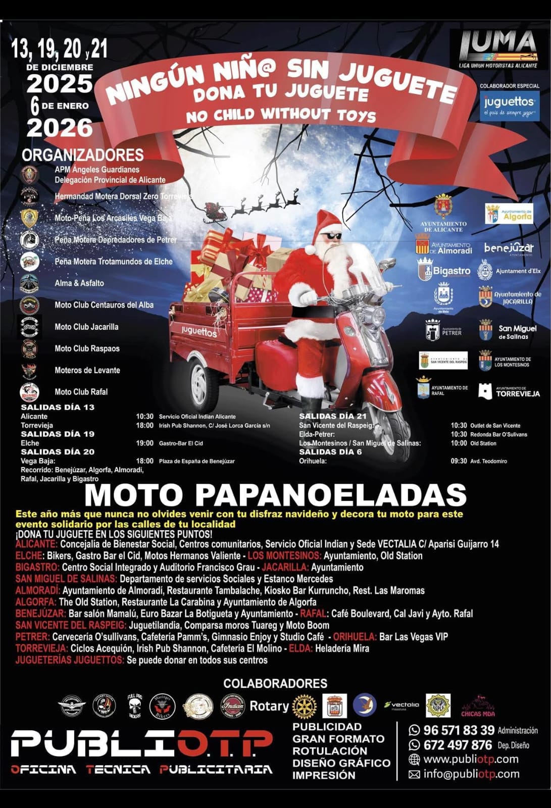 En este sexto año, todos los participantes continúan con la ilusión y fuerza de las primeras ediciones, que lograron convocar a centenares de moteros vestidos de ‘Papa Noel’, dando visibilidad a este acto, que tiene como fin una recogida de juguetes para los niños más desfavorecidos de la localidad y ciudades de toda la provincia de Alicante, a las que se adhieren por municipios otras peñas moteras consiguiendo una masiva participación.