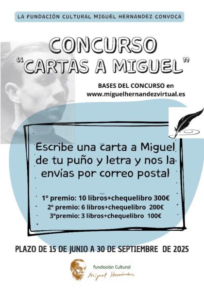 Ha sido fallado el concurso ‘Cartas a Miguel‘, organizado por la Fundación Cultural Miguel Hernández tras finalizar el pasado 30 de septiembre el plazo para la presentación de originales manuscritos. De medio centenar de cartas presentadas, procedentes especialmente de la comarca de la Vega Baja, pero también de otras poblaciones, y con autores de edades diversas, han sido elegidas cuatro.