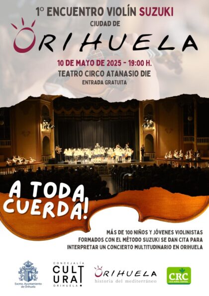 Orihuela se convertirá en el centro del talento juvenil con la celebración del I Encuentro Violín Suzuki, organizado por la Concejalía de Cultura, y que reunirá a más de 100 niños y jóvenes violinistas, formados bajo el prestigioso Método Suzuki, para ofrecer un concierto multitudinario en el emblemático Teatro Circo ‘Atanasio Die’.